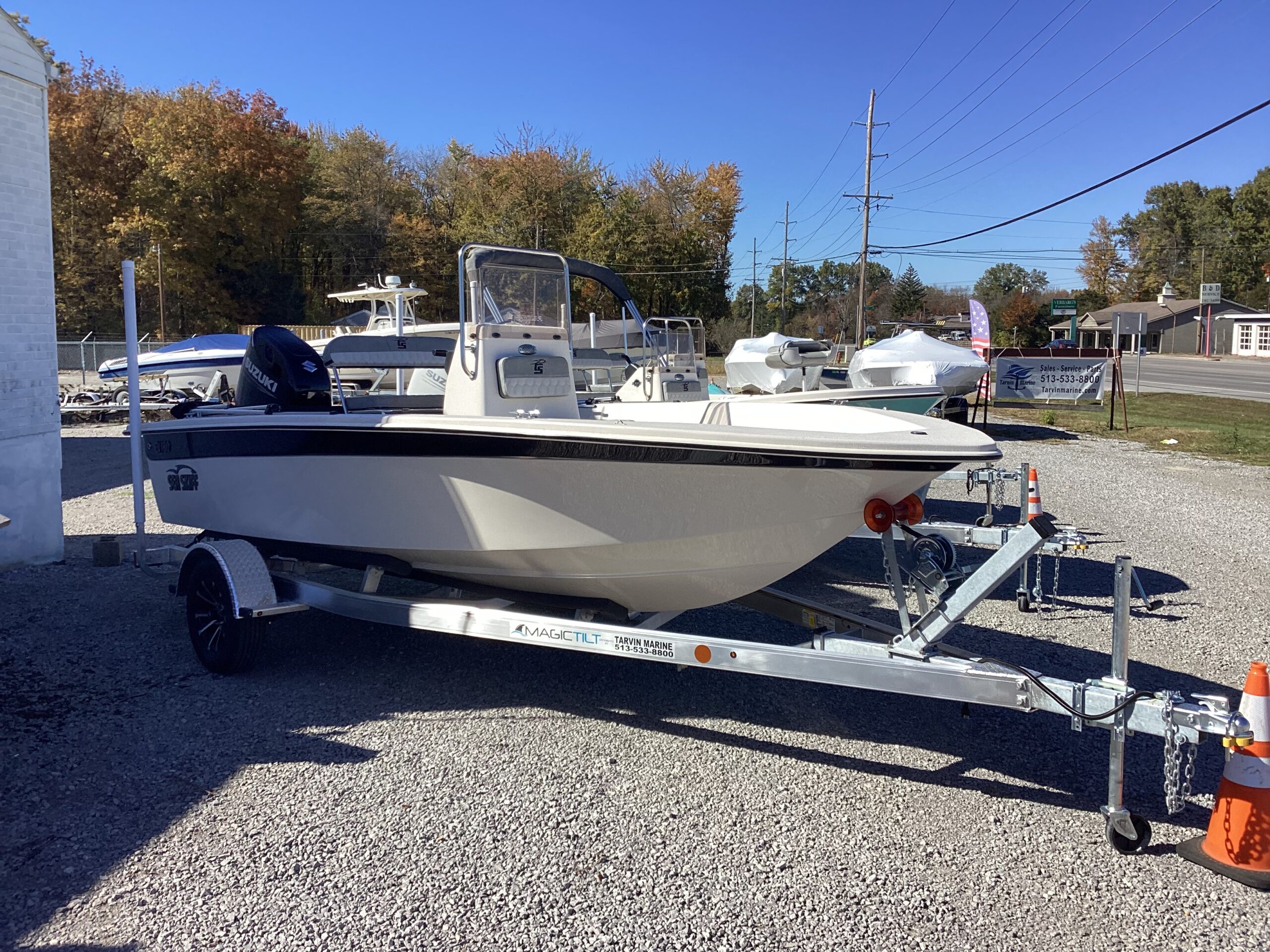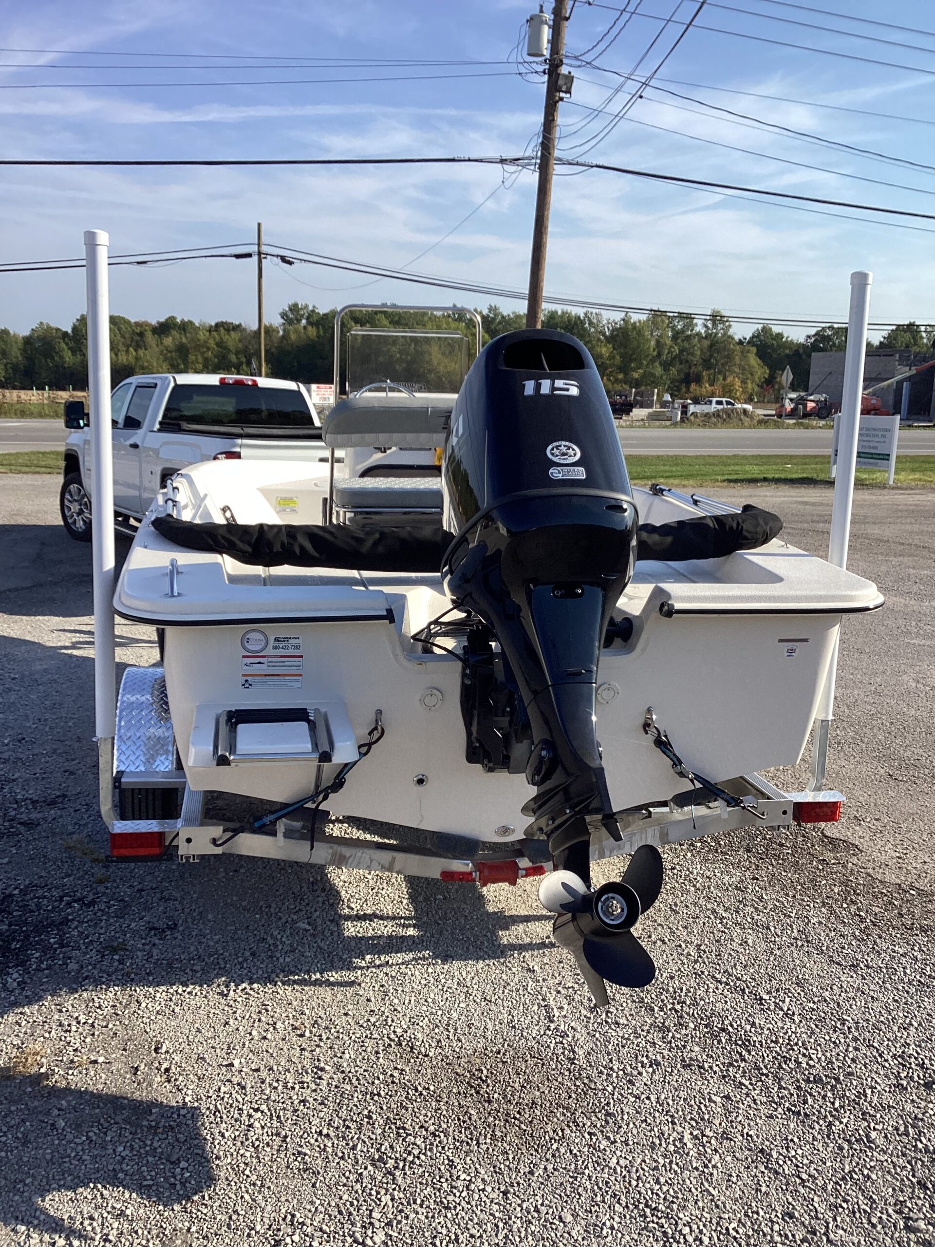 Center console with grab bar, windshield and extensive instrument panel. Speedometer and tachometer. Tilt steering. Stern livewell. Swim ladder. Rod holders. Washdown hose. Battery cutoff switch. Aluminum propeller. Trolling motor ready. Flip forward/ backward reclining bench seat. Included Igloo Cooler under bench seat. Fuel injected 4 stroke outboard. Water separating fuel filter. Aluminum trailer with LED lights, mag wheels and guide on poles with pvc vertical tubes.