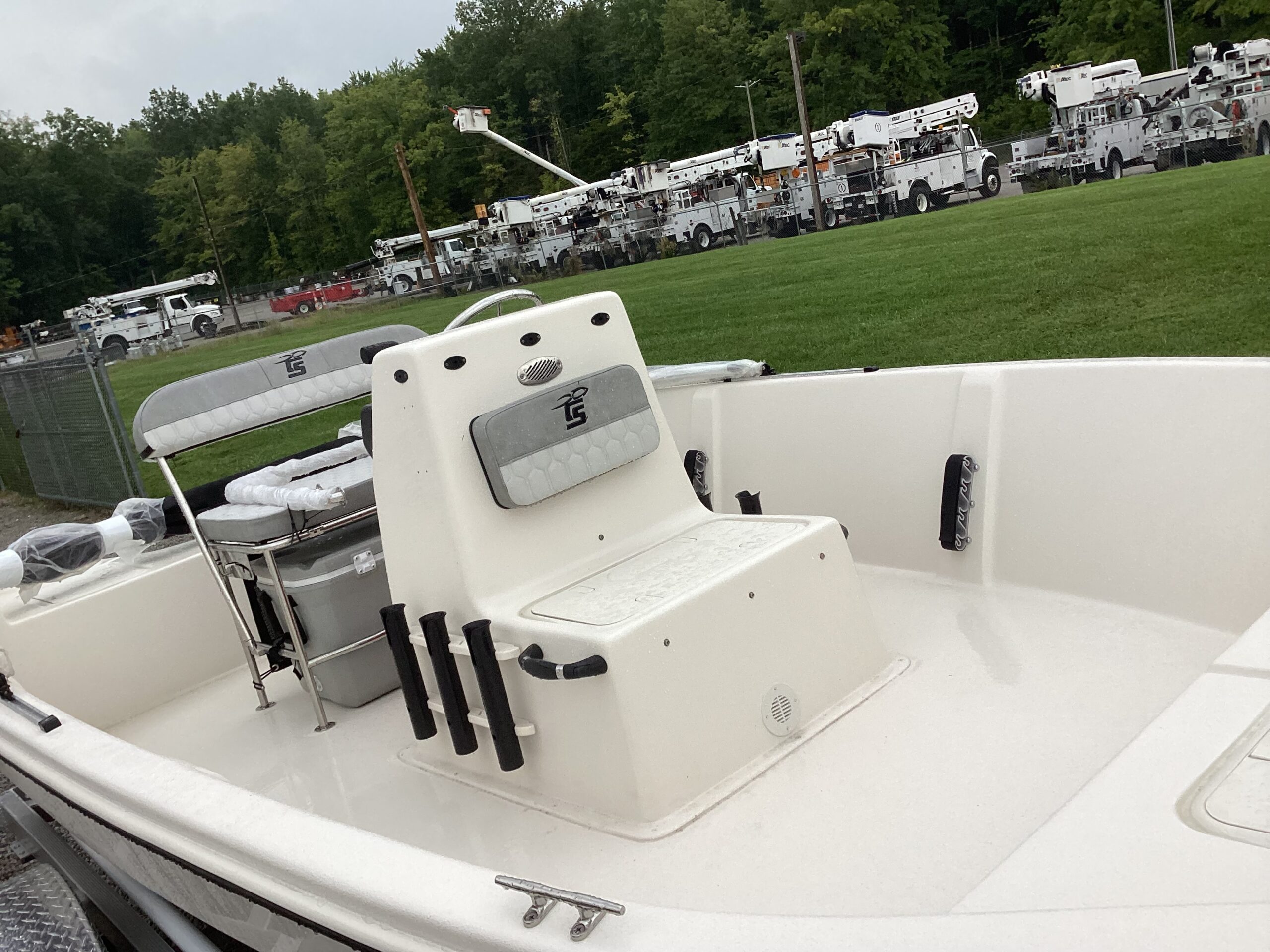 Center console with grab bar, windshield and extensive instrument panel. Speedometer and tachometer. Tilt steering. Stern livewell. Swim ladder. Rod holders. Washdown hose. Battery cutoff switch. Aluminum propeller. Trolling motor ready. Flip forward/ backward reclining bench seat. Included Igloo Cooler under bench seat. Fuel injected 4 stroke outboard. Water separating fuel filter. Aluminum trailer with LED lights, mag wheels and guide on poles with pvc vertical tubes.